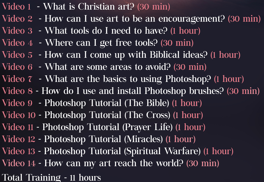 All of the videos can either be streamed or directly downloaded. Also, feel free to use any of the stock images and photoshop brushes in your own projects. I hope all of these resources are helpful for you to get started with making your own Christian artwork. Happy creating and good luck!