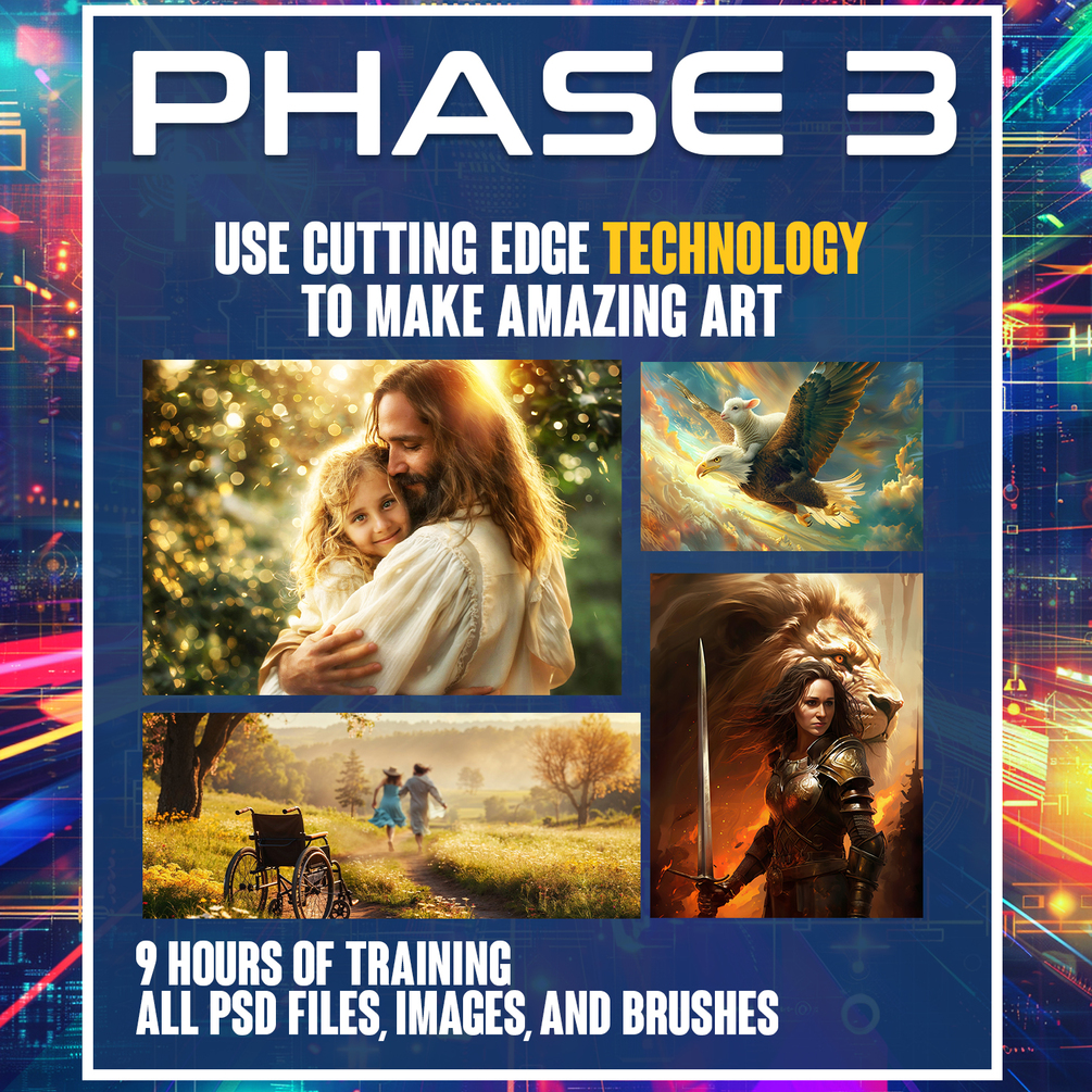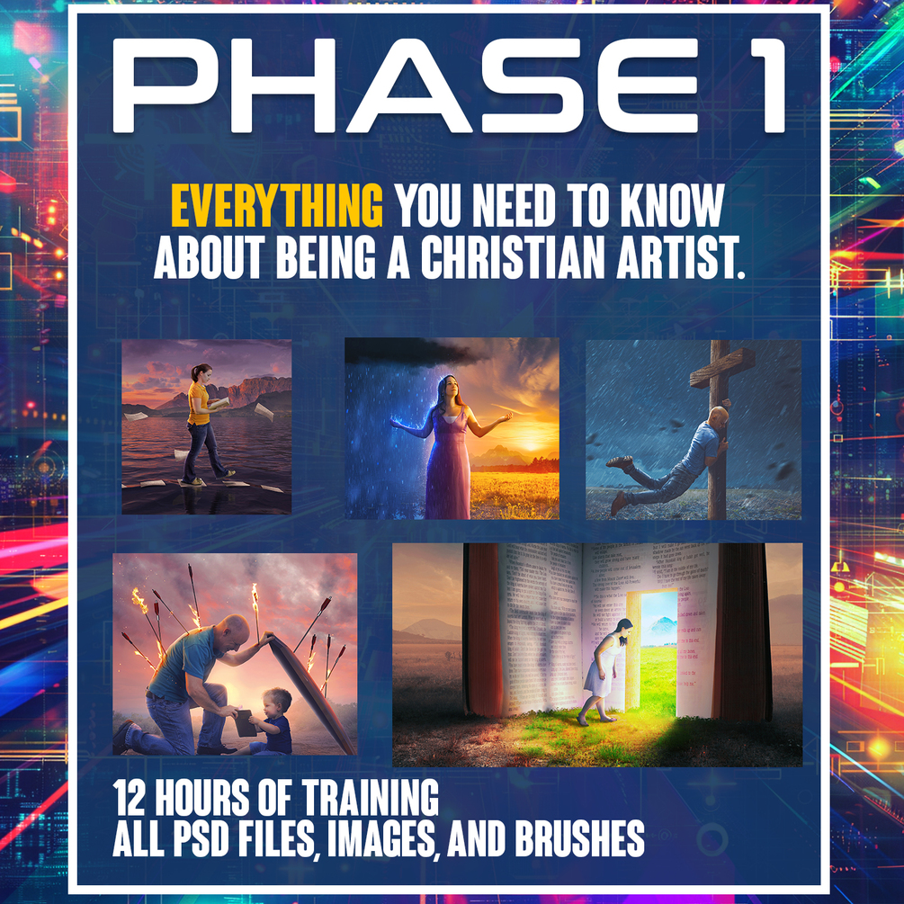 Learn everything I know about creating digital artwork using photography, photoshop, and other tools! This is a vast 30+ hour training program that will dive deep into my creative process for making digital artwork, coming up with creative Christian concepts, and using the latest innovations in AI technology to bring these ideas to life. The Complete Course consists of 38 full episodes, as well as all of the stock images, brushes, and PSD files.